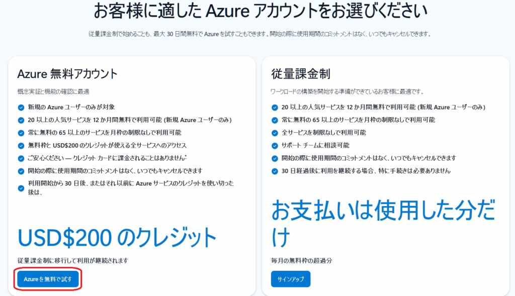 2.「Azureを無料で試す」を選択。