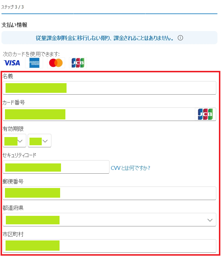 7.画面右側の「支払い情報」に支払いのためのクレジットカードまたはデビットカードを入力し、「サインアップ」をクリック。