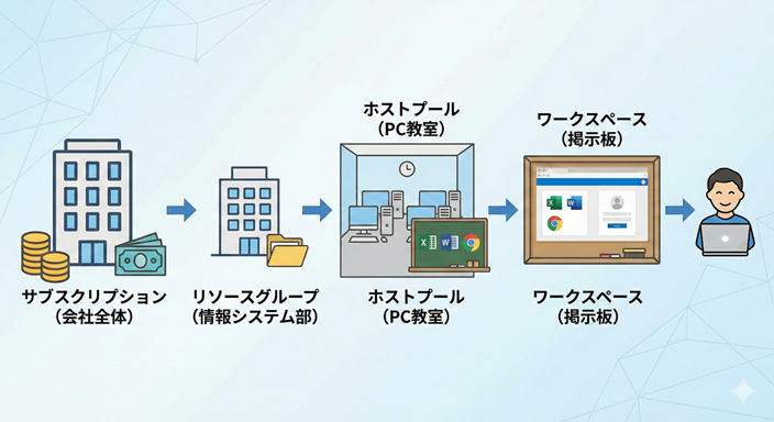 AVDの各設定はバラバラに存在しているのではなく、Azureの大きな管理単位の中に「入れ子構造」で収まっています。
