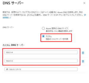 - 仮想ネットワーク(VNet)の「DNSサーバー設定」を開きます。