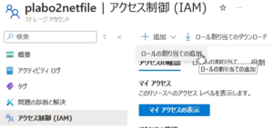 ストレージアカウントの「アクセス制御 (IAM)」で、AVDユーザーに「ストレージファイルデータSMB共有の共同作成者」ロールを割り当てます。