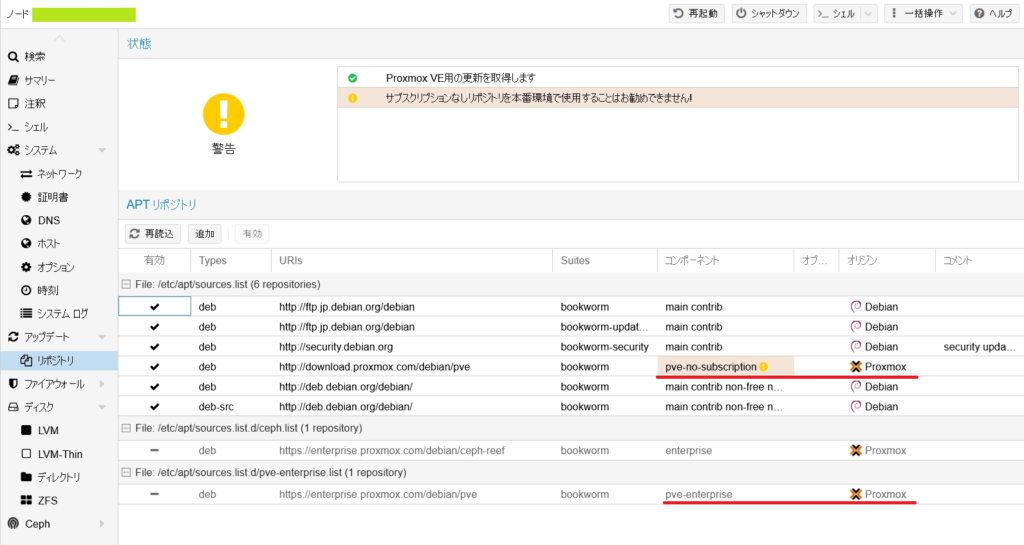 「ノード名」→「リポジトリ」を開き、pve-enterprise の項目を選択して「Disable」をクリックします。