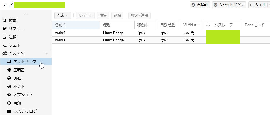「ノード名」→「Network」を開くと、最初から vmbr0 が作成されているはずです。